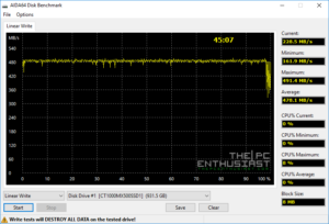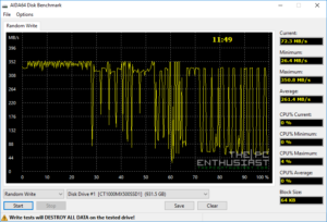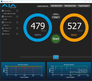 Let’s investigate further and see how the MX500 SSD performs with AJA Systems benchmark tool.
